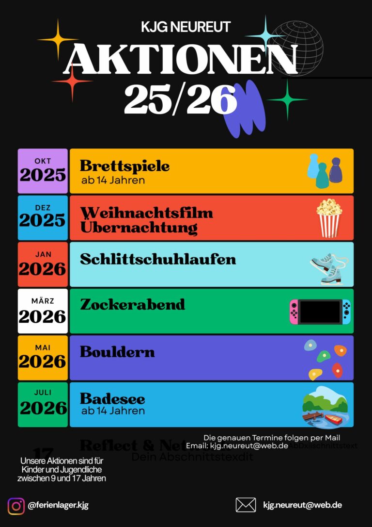 Unter dem Jahr können sich alle Lagerteilis und auch deren Freunde und neu interessierte Kinder bei den KjG-Aktionen wiedertreffen. Diese werden auf Instagram beworben oder ihr könnt eine Mail an die KjG schreiben, um in den Newsletter aufgenommen zu werden.